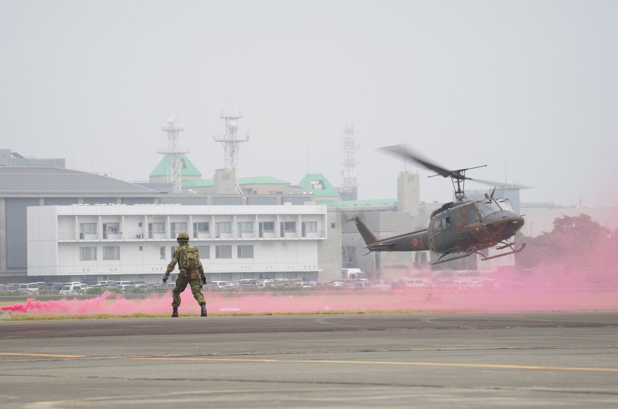 自衛隊の隊員が発煙筒を焚き、ヘリを誘導します。