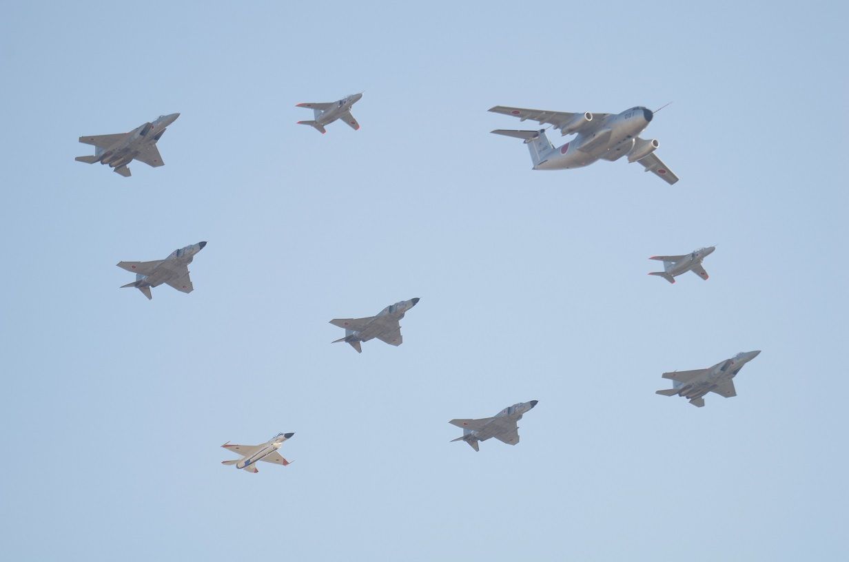 C1輸送機×1、T-4×2、F-15J×2、F-4EJ×3、F-2A×1の大編隊です。