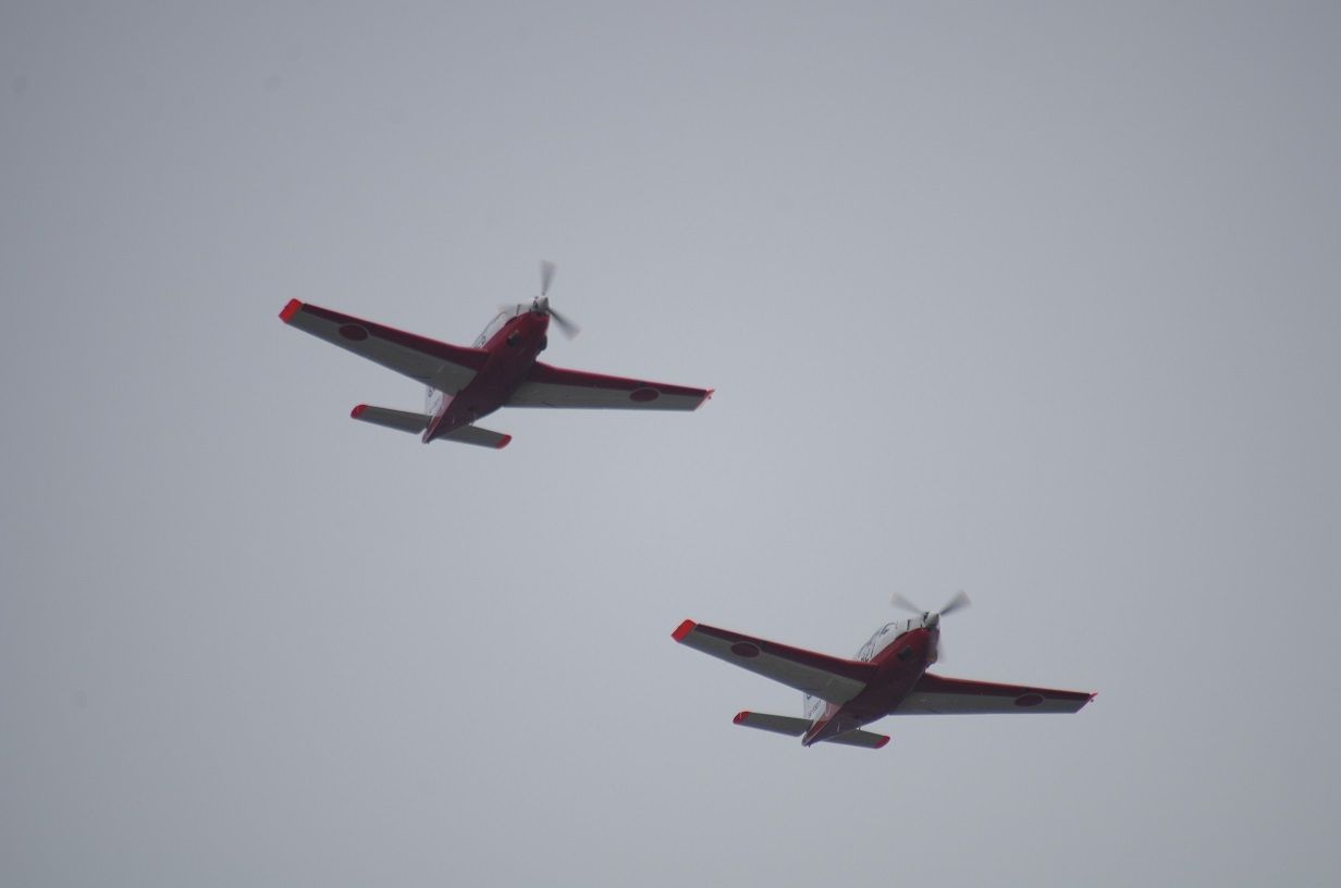 「T-7初等練習機」2機による編隊飛行です。