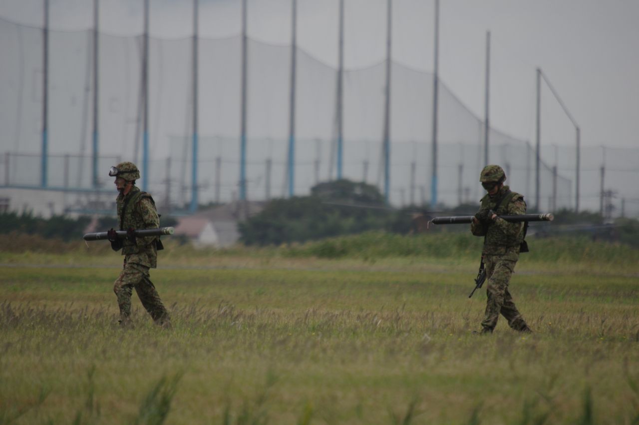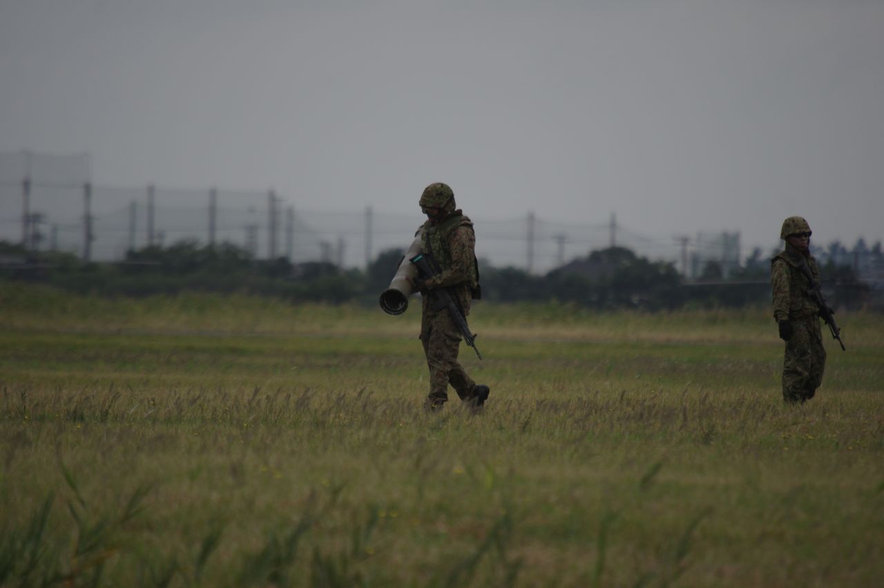 2名の隊員が「70mmロケット弾」を運搬しています。