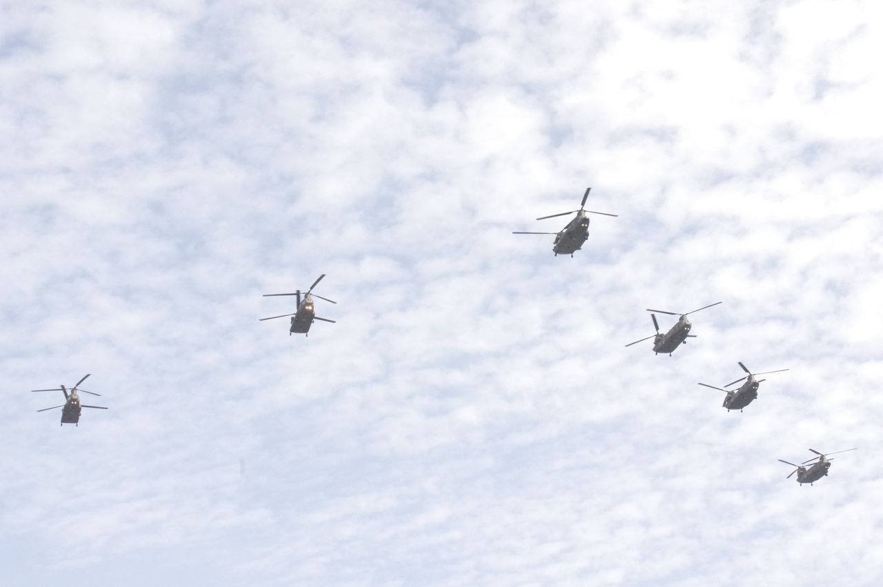 指揮官の搭乗した機体と同型の、輸送ヘリ CH-47J/JAの6機編隊。