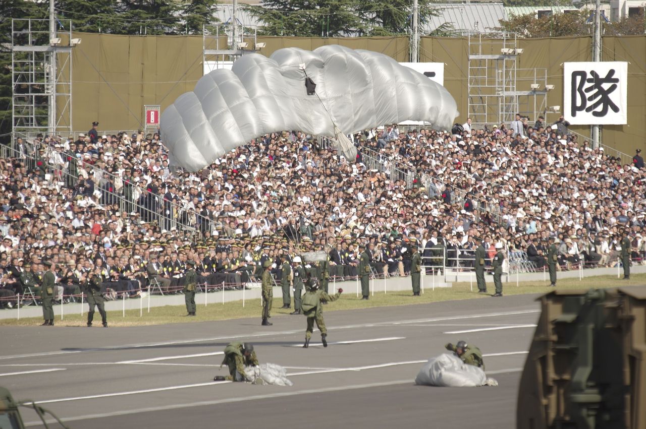 観閲行進にも参加している、習志野の第1空挺団による空挺降下でした。