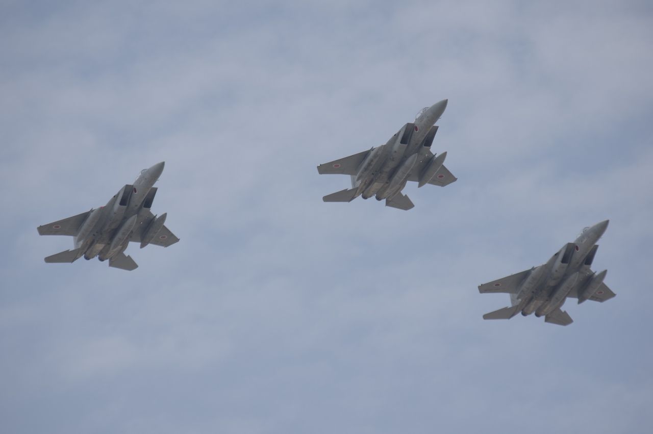 飛行部隊最後は、航空自衛隊 要撃戦闘機 F-15Jの3機編隊です。