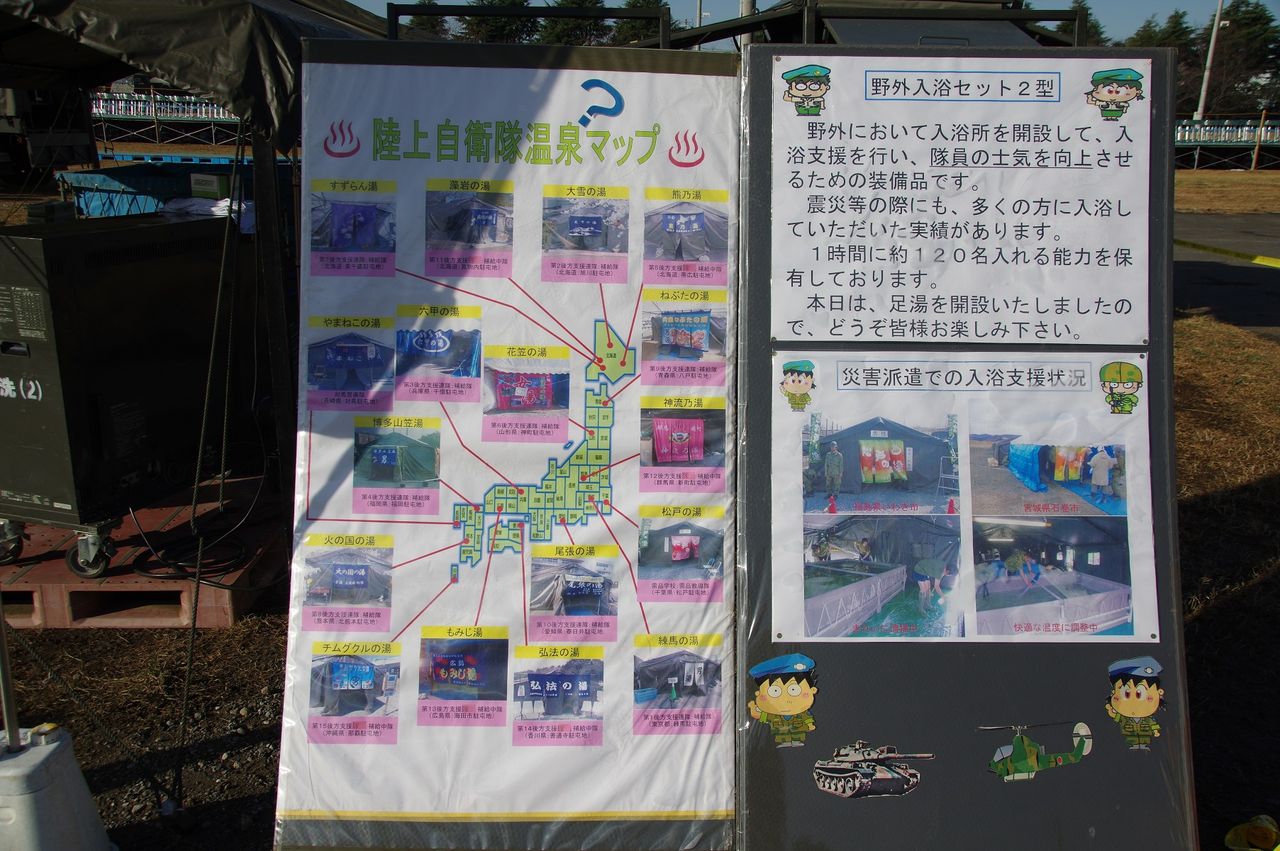 右の白と青の車両は、隊員の健康診断のための車両の様です。